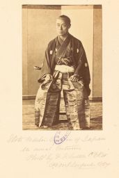» Ce portrait du shōgun Yoshinobu, et le précédent, ont été très diffusés comme « cartes de visite » par l’atelier de Felice Beato à Yokohama. Sutton était naturellement conscient que ces portraits pouvaient être exploités sur le plan commercial, et ce sont les seules photographies de son portfolio qu’il a protégées au titre de la propriété intellectuelle. 1. SUTTON Frederick William, Sixth Reading for Lantern Exhibitions of Travels in the Eastern Island World, China, Loo-Choo, and Japan : Japan, Londres, W.F. Stanley, n.d. [v. 1882], p. 4-5.Notes