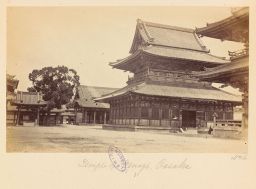 Cette photographie prise depuis la pagode, du toit de laquelle on voit l’avancée sur la droite, montre le Kondō ou « Pavillon d’Or » du temple Shitennō-ji et plus loin le Kōdō, ou « Salle d’Audience ». Le Kondō abritait l’une des toutes premières sculptures bouddhiques du Japon, la statue du bodhisattva Nyoirin Kannon, qui y avait été établie par le fondateur du temple, Shōtoku taishi. Lafcadio Hearn, tentant de décrire le Shitennō-ji trente ans plus tard, peinait à trouver les mots pour exprimer « la bizarre et mélancolique beauté de l’endroit » : « Pour savoir ce qu’est le Tennoji, il faut voir son étrange délabrement, – la beauté des tons neutres des vieilles poutres, les gris et les jaunes fantomatiques et fanés de ses murs, les décapements excentriques, les sculptures extraordinaires sous les auvents – sculptures de vagues, de nuages et de dragons et de démons, autrefois splendides dans leurs dorures et leurs laques, aujourd’hui blanchis par le temps, couleur de fumée et semblant, comme elle, sur le point de disparaître en volutes