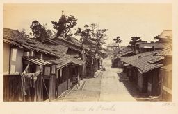 Le lieu de cette prise de vue est difficile à identifier. On aperçoit les portes, ou torii, de deux sanctuaires. Les activités photographiques de Sutton à Ōsaka semblent s’être limitées au château au nord de la ville, au temple de Shitennō-ji au sud, et au sanctuaire d’Ikukunitama à l’ouest ; il est peu probable qu’il ait été autorisé à aller très à l’est de la voie principale menant au château. Il est possible qu’il s’agisse du quartier autour du temple de Seihōji, où Sir Harry Parkes et sa suite étaient logés durant leur séjour à Ōsaka.