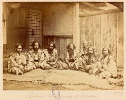 ». Sutton a pris cette photographie et la suivante à la résidence de Thomas Blakiston, homme d’affaires britannique, explorateur et zoologiste qui vivait à Hakodate depuis 1861, et qui a persuadé ce groupe d’Aïnous de bien vouloir poser pour lui. Curieusement, Sutton et Blakiston parleront plus tard de sept Aïnous invités à poser, mais six seulement figurent sur ce cliché. 1. SUTTON Frederick William, Seventh Reading for Lantern Exhibitions of Travels in the Eastern Island World, China, Loo-Choo, and Japan : Old and New Japan, Londres, W.F. Stanley, n.d. [v. 1882], p. 14.Notes
