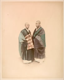 Notons qu'il n'y a pas, dans cet album, de portrait de prêtre shintō – bien que le studio de Stillfried & Andersen en propose plusieurs. Le voyageur a composé son album en choisissant des portraits sans volonté d'exhaustivité. Les moines sont toujours accompagnés d'un novice qu'ils forment. Pour le même sujet par Felice Beato, les deux religieux sont soit côte à côte, soit l'un derrière l'autre. Stillfried a composé ce sujet classique différemment les disposant face à face, de trois-quarts, en symétrie axiale dans une sorte d'égalité et de confrontation. Une vision esthétisée et personnelle du bouddhisme, loin de sa réalité sociale.