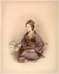 Cette jeune femme, dans l'intimité de son foyer, a le col de son kimono recouvert d'un surcol noir pour le protéger, comme lorsque l'on s'adonne aux tâches ménagères. Elle s'est accordée une pause pour fumer un kiseru. Cette photographie de Stillfried, détourée en médaillon, a souvent été attribuée à Felice Beato. Cela n'a rien d'étonnant car elle est très proche stylistiquement d'un autre portrait de femme par Beato. Stillfried, peintre de formation n'a appris la photographie qu'une fois arrivé au Japon, vers 1870, et il a été formé par Beato lui-même. Ces premiers portraits et paysages sont très proches en terme de sujet et de composition de ceux de son mentor et il est parfois difficile de les différencier.