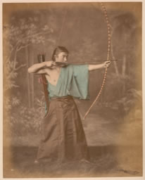 Seuls les membres de la classe des samouraïs avaient le droit de posséder des armes et de pratiquer les arts martiaux. Jusqu'au xive siècle, l'arc était l'arme favorite des guerriers japonais, avant même le katana, et se pratiquait généralement à cheval, une pratique qui a perduré dans le yabusame. Le premier photographe professionnel japonais, Ueno Hikoma pratiquait le kyūdō à Nagasaki et plus près de nous Henri Cartier-Bresson a emprunté son concept « d'instant décisif » à cet art martial. Aujourd'hui, un million et demi de Japonais pratiquent encore le kyūdō. 1. Le terme kyūdō fait son apparition dans diverses écoles dès le xviie siècle, mais ce n'est qu'après la Seconde Guerre mondiale suite au désarmement imposé par l'occupant américain, qu'une fédération japonaise de kyūdō (la Zen Nippon Kyudō Renmei) voit le jour.Notes