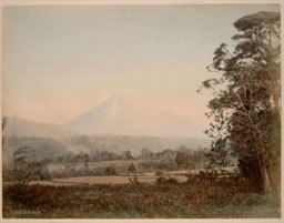 Ici, la légende indique Fujiyama, une prononciation erronée assez fréquente chez les Occidentaux au xixe siècle. La lecture correcte en japonais est Fujisan (富士山 « mont Fuji »). La confusion vient du fait que le kanji pour montagne (山) a deux lectures possibles en japonais, yama et san mais dans ce contexte, on prononce toujours san. Au Moyen Âge on trouvait parfois la lecture poétique Fuji no yama. En 2013, le Fuji a été inscrit au patrimoine mondial de l'UNESCO sous le titre « Fujisan, lieu sacré et source d'inspiration artistique ». Stillfried n'a pas précisé d'où était prise cette vue du Fuji. Il est ici vu de l'ouest, par beau temps, probablement au printemps, le manteau neigeux se maintenant jusqu'au mois de mai. La mise en couleur permet d'atténuer le manque de contraste de l'épreuve au niveau de la montagne et de bien étager les différents plans en atténuant graduellement la densité ce qui donne une perspective atmosphérique assez réussie à ce paysage. 1. OGAWA Kazumasa, Fujisan, Tōkyō, publié par K. Ogawa, 1912 (Meiji 45), 24 épreuves noir & blanc en similigravure, introduction.Notes