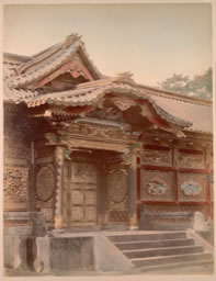 . Nakamon-mon, signifie « porte du milieu ». On y parvient après avoir traversé la première enceinte par la porte Chokugaku-mon (cf. AP11424) et être passé le long du clocher (cf. AP11423). Stillfried a opté pour un cadrage serré, privilégiant la décoration de la porte à une vue d'ensemble en situation. La porte est richement décorée, les tuiles de l'avant-toit sont ornées du mon de la famille Tokugawa – la « triple rose trémière