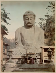 Stillfried redonne plus de dignité à ce Bouddha en le mettant en scène avec un prêtre bouddhiste en train d'officier. On remarque une structure en bois derrière la lanterne de bronze de droite qui n'existait pas à l'époque Bakumatsu quand Felice Beato a photographié le monument. Au plus fort du mouvement haibutsu kishaku (廃仏毀釈), engendré par la politique du gouvernement de Meiji de séparation du bouddhisme et du nouveau shintō d’État, il fut même sérieusement question de le vendre à la ferraille. Henri Cernuschi (1821-1896), profita d'ailleurs de cette agitation pour acheter et exfiltrer un Bouddha de grandes dimensions lors de son voyage au Japon en 1871. De même, Émile Guimet (1836-1918), qui voyagea dans le pays entre 1876 et 1877, rapporta des quantités de statues en France, car les temples bouddhiques préfèraient les lui donner plutôt que de les jeter ou de les laisser détruire.