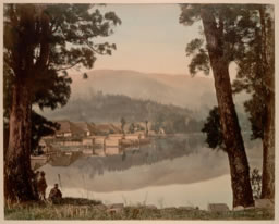 Cette superbe photographie de Beato apparaît encore dans des albums ultérieurs de Stillfried & Andersen dans une version recadrée portant le no 327. Le lac Ashi est un lac de caldeira, de 21 km de circonférence, formé dans le cratère effondré du volcan de Hakone, il y a environ trois mille ans. Par beau temps, le mont Fuji se reflète dans ses eaux, une composition classique dans les albums de Yokohama shashin (photographie souvenir) des années 1890.
