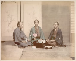 Ici, trois marchands (d'après la légende originale de Stillfried) savourent un repas. Celui de gauche est vêtu d'un simple yukata, un kimono de coton que l'on pouvait revêtir à l'auberge pour aller prendre un bain. Celui du centre semble porter un hakama, ce qui n'est pas une tenue de l'ancienne classe des marchands. Deux des trois modèles de cette photographie posaient habillés en samouraïs dans une autre épreuve de cet album (cf. AP11331) et celui-ci ne s'est peut-être pas changé entre deux mises en scène. Stillfried utilisait peut-être pour modèles certains de ses nombreux employés. En 1875 le studio employait quinze personnes.