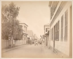 Sur cette épreuve, on remarque un godown en briques – suivant le terme anglais utilisé à l'époque pour désigner les entrepôts des ports asiatiques – du côté gauche de la rue.