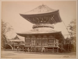 étaient rares et uniques au Japon ; il n'y a pas d'exemple d'architecture similaire dans le bouddhisme chinois. 1. Le nom donné par le studio de Stillfried & Andersen à ce temple, Sumiyoshi, est peut-être une erreur car le nom réel du temple est Tsuruoka-Hachiman (鶴岡八幡宮). Le plus connu des temples portant le nom de Sumiyoshi est le sanctuaire shintō Sumiyoshi taisha (住吉大社) à Ōsaka. Néanmoins, il y a un lien entre Hachiman et Sumiyoshi. Hachiman est la divinité shintō (kami) de la guerre sur terre et Sumiyoshi est le kami de la guerre sur mer. 2. Un exemplaire est conservé dans un album de Beato du Victoria & Albert museum à Londres. 3. Cf. Le Tour du Monde, no360, p. 327, 1866. Gravure avec pour légende : « Pagode d’Hatchiman (détail.). — dessin de Thérond d’après une photographie [de Beato] et une aquarelle de M. Roussin ». La photographie et la gravure sont reproduites dans : ESTEBE Claude, Yokohama Shashin, Paris, YellowKorner, 2014, p. 11 et p. 13. 4. Un tahōtō (多宝塔 « pagode ornée de nombreux bijoux ») est un type de pagode japonaise trouvée principalement dans les temples bouddhiques des écoles Shingon et Tendai du bouddhisme Vajrayana. Cette forme est unique parmi les pagodes car elle semble comprendre un nombre pair d'étages (deux). En fait, elle n'a réellement qu'un étage utile, le second étage étant juste une balustrade décorative inaccessible. Notes