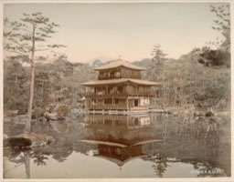 à été construit par le troisième shōgun Ashikaga, Yoshimitsu (1358-1408), en 1397 au nord-ouest de la capitale impériale, Kyōto. Après sa mort, selon ses voeux, il devint un temple Zen de l'école Rinzai. Le pavillon est construit dans un style composite mais harmonieux qui combine trois styles d'architectures : palais de époque Heian de style Shinden-zukuri pour le rez-de-chaussée, demeure de samouraï de style Buke-zukuri pour le premier étage et temple Zen de style Karayō pour le deuxième étage. Le toit en chaume est surmonté d'une sculpture de phénix chinois, l'oiseau de feu. Les autres bâtiments de ce temple furent incendiés et détruits pendant la guerre civile d'Ōnin (1467-1477) mais le pavillon d'or avait survécu jusqu'en 1950 où il disparut dans un incendie volontaire provoqué par un jeune moine. Cet épisode à inspiré le roman éponyme de Yukio Mishima, Le pavillon d'or, publié en 1956, où Mishima imagine que c'est la beauté paroxystique du temple qui a fait basculer le jeune novice dans la folie. Le pavillon a été reconstruit en 1955 et est entièrement doré à la feuille d'or. Ce bâtiment et son jardin, célébrés pour leur beauté, sont aujourd'hui un des symboles de Kyōto et le temple a été inscrit en 1994 sur la Liste du patrimoine mondial de l'UNESCO. À l'époque Bakumatsu, pour les Occidentaux, Kyōto n'était accessible qu'aux diplomates. Stillfried a voyagé dans le Kansai en mai 1872. Il a débarqué à Kōbe et a visité Ōsaka et Kyōto qui était temporairement ouverte aux étrangers pour la première exposition annuelle. Sa vue du Kinkaku-ji est prise face à la « mare miroir » (Kyōko-chi 鏡湖池), conçue pour que le pavillon puisse se refléter entièrement dans l'eau. 1. Le Kinkaku-ji est le nom usuel du temple Rokuon-ji (鹿苑寺 « temple impérial du jardin des cerfs »).Notes