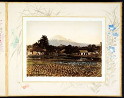 » Nombreuses sont les œuvres représentant le mont Fuji dans l’art japonais. Cette iconographie a été perpétuée par la photographie et le Fuji a été documenté depuis différents points de vue, différentes saisons et sous différentes conditions atmosphériques. Ici, le mont Fuji est vu de l’ouest, par beau temps, depuis le village d’Imaizumi (今泉) dans le district de Suruga (駿河), près de Shizuoka. Un point de vue qui met en relief la légère dissymétrie de ses pentes car sur le versant sud-est s’élève une excroissance. C’est le cratère secondaire Hōei (宝永) formé lors l’éruption de 1707 (quatrième année de l’ère Hōei) et qui a entaché la symétrie de la forme de la montagne. Lors de cette éruption, la dernière à ce jour, la pluie de cendres était retombée jusqu’à Edo. En 2013, il a été inscrit au patrimoine mondial de l’UNESCO sous le titre « Fujisan, lieu sacré et source d’inspiration artistique ». 1. OGAWA Kazumasa, Fujisan, Tokyo, publié par K. Ogawa, 1912 (Meiji 45), 24 épreuves noir & blanc en similigravure, introduction. Notes