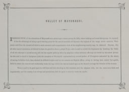 VALLEE DE MAYONASHI. OUTRE ses attractions comme un refuge pittoresque au milieu des collines, où l'on peut apprécier la baignade et la pêche à la truite, Mayonashi [Miyagase] a l'avantage d'être une bonne base de départ pour la montagne sacrée de Oeyama – la plus haute de la chaîne qui entoure le Fusi-yama [mont Fuji] – et du sommet de laquelle on a une vue vaste et complète des environs. Oeyama, comme toutes les montagnes sacrées, est censée avoir son démon gardien, yelept Tenjo – qui montrerait son mécontentement en brisant les membres de tous ceux qui tentent de gravir la montagne par tout autre côté que la voie régulière emprunté par les pèlerins, où des offrandes tributaires sont prélevées par les prêtres en fonction. Comme cette route est fermée aux étrangers (à l'exception des représentants ministériels), plusieurs groupes d'étrangers – attirés par le charme de goûter le fruit défendu, ont escaladé cette montagne difficile – et à une occasion un officier anglais, qui avait été mal conseillé par un guide, à échoué à atteindre le sommet et s'est cassé la jambe accidentellement, ce que les locaux ont considérés comme la vengeance du démon pour l'invasion de son domaine. On dit que c'est un bon endroit pour chasser le sanglier et le cerf dans cette montagne et les collines adjacentes mais le couvert est si épais et impénétrable et la région est si pentue et escarpée que le jeu en vaut à peine la chandelle.