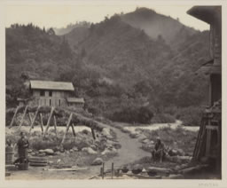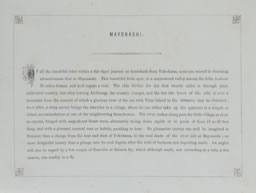 MAYONASHI. DE toutes les belles promenades à une bonne journée de cheval de Yokohama, aucune ne surpasse le charmant attrait de Mayonashi [Miyagase]. Ce bel endroit dans une vallée, resserrée parmi les collines, est à environs 35 miles de distance, et mérite vraiment une visite. Pendant les vingt premiers miles on chevauche à travers une plaine cultivée, mais après avoir quitté Atchiungi [Atsugi], le paysage change, et les deux dernières heures sont de la montagne, du sommet de laquelle on a une vue splendide sur la mer, avec l'île de Vries [Izu Ōshima] dans le lointain ; peu après, une montée raide amène le voyageur à un village, où il peut prendre ses quartiers dans un temple ou être logé dans l'une des fermes voisines. La rivière gronde le long du petit village, limpide comme du cristal, bordée de magnifiques arbres de forêt, alternant des rapides et des bassins de 15 à 20 pieds