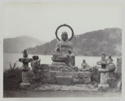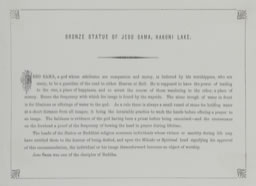 STATUE DE BRONZE DE JESO SAMA [Jizō]–LAC DE HAKONI [Hakone]. JESO SAMA [Jizō], un dieu dont les attributs sont la compassion et la miséricorde, est considéré par ses adorateurs, qui sont nombreux, comme un gardien de la route qui mène soit au Paradis, soit à l'Enfer — il est censé avoir le pouvoir de conduire à l'un, un lieu de bonheur et d'arrêter la dérive de ceux qui errent vers l'autre, un lieu de misère ; d'où la fréquence à laquelle son image se trouve au bord des chemins. L'auge de pierre pour l'eau, devant, est pour les libations ou offrandes d'eau au dieu. En règle générale, il y a toujours une petite vasque de pierre pour conserver de l'eau près de toutes les images ; ceci pour l'invariable pratique de se laver les mains avant d'offrir une prière à une image. La calvitie est la preuve que ce dieu avait été un prêtre avant d'être canonisé et la bosse sur son front une preuve de la fréquence de ses saluts de tête dans la prière durant toute une vie. Les chefs du Sintoo ou de la religion bouddhiste proposent les personnes dont les vertus ou la sainteté pendant leur vie les auraient mené à l'honneur d'être déifié, et si le Micado [Mikado / empereur] ou le chef spirituel signifie son accord à cette recommandation, la personne ou son image devient désormais un objet de culte. Jeso Sama était l'un des disciples de Bouddha.