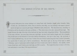 THE BRONZE STATUE OF DAI-BOUTS. IN a pretty little grove, the avenue leading to it being lined with Camelias clipped rather formally, Oaks, Conifers, &c., and Azaleas also, which, when in blossom, about May, are very striking—this statue is placed. Inside the figure are numerous gilt images of Buddhist saints, shrines &c. The dimensions are, according to a description sold by the priest on the spot, as follows: —“The whole body is five jio’s (about 50 feet) high. The “height between the edge of the hair of the head and the legs, bent easily, being about 42 feet. The circumference of the body is 98 feet; the stone base 4 feet and a half high; the face 8 and a half in length, and 18 in breadth. The circular spot on the forehead is 1 foot and a half in circumference; the eyes 4 feet long; the eye-brows 4 feet 2 inches and a half long. the ear 6 feet 7 inches: the nose 3 feet 9 inches long and 2 feet 4 inches in breadth; the mouth 4 feet 3 inches and a half in circumference. The shaved part on the top of the head is called ‘Nik’koku,’ and is 9 inches and a half in height and 2 feet 4 inches and a half in diameter; the spirally curled locks of head hair, each 9 inches and a half high, are 830 in number. The length from knee to knee is 36 feet, and each thumb is more than 3 feet in circumference.”