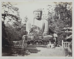 . Le Grand Bouddha (daibutsu 大仏) du temple bouddhique Kōtoku-in (高徳院) de Kamakura s'impose aujourd'hui comme une des images emblématiques du Japon. Pourtant, il est peu représenté dans l'art japonais de l'époque Edo et n'apparaît pas dans les célèbres séries de paysages de Hokusai et de Hiroshige. C'est la photographie de voyage qui va imposer cette image dès les années 1860. Mais dans les albums de Beato, peut-être sa première apparition en photographie, il apparaît plus comme une curiosité que comme un lieu saint du tourisme. Deux japonais qui accompagnent Beato posent perchés sur l'imposant Bouddha, ce qui est aujourd'hui interdit, peut-être pour donner l'échelle. Un Occidental est assis devant le Bouddha, à gauche et le personnage assis au premier plan à droite pourrait être Felice Beato lui-même. 1. Le bâtiment qui abritait la statue fut détruit une première fois par une tempête en 1334, reconstruit, puis endommagé par une autre tempête en 1369 et fut encore reconstruit. Le dernier bâtiment fut emporté par le tsunami du 20 septembre 1498 durant la période Muromachi et depuis la statue est exposée à l'air libre. Notes