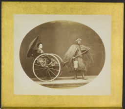 La jeune femme – probablement une geisha – au visage soigneusement fardé de blanc et tenant une ombrelle, contraste fortement avec le pousseur âgé, au visage marqué et au teint sombre, accentué par la sensibilité sélective au bleu du procédé au collodion humide employé à l'époque. Il est vêtu d’un mino, vêtement de pluie tressé en paille de riz, et chaussé de waraji, sandales également en paille de riz. Il tient à la main une lanterne en papier laissant supposer une course de nuit, comme pour une geisha se rendant à une maison de thé (ochaya) pour divertir un yashiki (banquet). Des petites pierres calent les roues du jinrikisha pour lui éviter de bouger pendant le long temps de pose. L'homme est également adossé à un appui dont on aperçoit le trépied en fonte. La découpe ovale de la composition permet de focaliser la scène et de minimiser l'aspect artificiel de la prise de vue arrangée en studio. Une épreuve similaire est conservée dans la collection d'Erwin Dubský