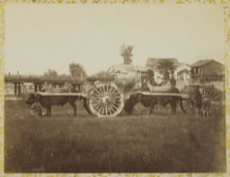 Comme pour l'épreuve présentant un groupe de pêcheurs devant le célèbre pont Togetsu à Arashiyama (cf. 10543) nous sommes dans une logique de reportage où la ville de Kyōto est juste le décor naturel d'une scène de genre et non un paysage à part entière. On retrouve la même logique dans la vue suivante (cf. 10557) d'une scène de labourage près du sanctuaire d'Ikuta à Kōbe. La même page de l'album comporte deux épreuves l'une en dessous de l'autre. Celle-ci et la suivante (cf. 10557). L'une prise à Kyōto, l'autre à Kōbe. Il semble que ces deux épreuves soient reliées par le sujet : l'utilisation d'animaux de trait (bœufs) dans les travaux agricoles. 1. Un tawara est un sac en paille de riz pouvant stocker du charbon, du grain ou du riz. Sa taille est normalisée, il contient environ 90 l de riz (cf. épreuve 10544 de cet album). 2. Ingénieur civil néerlandais, employé comme oyatoi, qui a résidé au japon de 1873 à 1878 (cf. épreuve 10542 de cet album).Notes