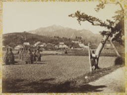 . Dans l'album, cette vue de taille moyenne, est collée sur la même page que la suivante (cf. 10559). 1. Les rizières dites sèches (kanden 乾田) sont irriguées mais sont asséchables à volonté, ce qui leur donnent de meilleurs rendements de riz et permet de les labourer avec des animaux de trait. Avant leur apparition, les rizières étaient toute l’année inondées (shitsuden 湿田). 2. La librairie Yushōdō (雄松堂) de Tōkyō avait ainsi proposé, il y a une dizaine d'années, dans un de ses catalogues, quelques épreuves d'Ichida de ce style, dont une vue du Kinkaku-ji. Voir également : 3. Par contre sur l'épreuve 10556, bien que le texte ne soit pas lisible car l'homme est quasiment de profil, on distingue clairement (à la loupe) qu'il y a quelque chose d'écrit sur le dos de son happi.Notes