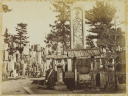 Plus précisément, l'inscription de cette stèle reproduit fidèlement la graphie particulière d'un nenbutsu tracé au pinceau à l'encre de Chine sur un rouleau par le saint bouddhiste Tokuhon. Tokuhon shōnin (1758-1818) fut un moine de l'école de la Terre pure (Jōdo shū 淨土宗) de la fin de l'époque Edo, célèbre pour ses calligraphies de nenbutsu. On trouve des stèles les reproduisants, appelées Tokuhon rokuji Myōgōtō (徳本六字名号塔), dans de nombreux temples bouddhiques rendant l'identification du lieu problématique. Notons toutefois la présence dans cet album d'une vue du cimetière d'un temple important de l'école de la Terre pure, le Kurodani-dera de Kyōto (cf. épreuve 10541) mais aucun lien entre ces deux vues n'a pu être établi pour l'instant. Dans l'album, cette vue de taille moyenne, est collée sur la même page que la suivante (cf. 10561). 1. Graphie en kanji (caractères chinois) utilisés à l'époque Edo. En japonais contemporain (post 1945), légèrement simplifié, la graphie est 南無阿弥陀仏.Notes