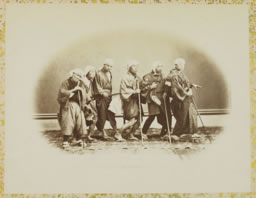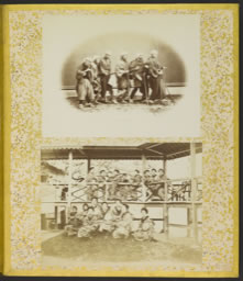 . Enfin, le premier personnage, qui a la responsabilité de guider ce groupe, est mieux vêtu, avec un kimono décoré qui rappelle celui de certains moines. Tout son corps est tendu pour percevoir de son mieux l'environnement et le chemin à suivre. La ressemblance avec l'œuvre de Brueghel est purement formelle, on n'y retrouve pas le message de la parabole, avec la chute du premier aveugle. Toutefois, Ichida Sōta aurait très bien pu s'en inspirer. Les œuvres classiques de la peinture occidentale circulaient largement au Japon sous forme de gravures et de reproductions photographiques. A fortiori, les reproductions d'œuvres d'inspiration religieuse avaient été amenées et diffusées par les nombreuses communautés religieuses installées dans les ports de concessions et cherchant à évangéliser les autochtones. Celles-ci avaient des liens étroits avec la photographie et les photographes. De nombreux prêtres utilisèrent la photographie à titre de loisir et pour attirer l'attention des officiels et des badauds. Plusieurs photographes importants ont ainsi appris l'anglais et la photographie par l'intermédiaire de missionnaires. Le plus connu est le peintre et photographe Shimooka Renjō (下岡連杖, 1823-1914) qui perfectionna sa technique photographique auprès de missionnaires à Yokohama à partir de 1862 et qui se convertit même au christianisme en 1882. Dans l'album, cette vue de taille moyenne, est collée sur la même page que la suivante (cf. 10565). 1. En particulier les femmes dont il existait une corporation de chanteuses aveugles itinérantes appelées goze (瞽女). Il y avait aussi des moines aveugles itinérants spécialisés dans la récitation de sutras ou de passages du Heike monogatari.Notes