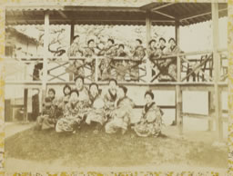 données au printemps près de la rivière Kamo. Cet événement qui dure du 1er au 30 avril, pendant la floraison des cerisiers, et qui est un des temps forts des festivals de Kyōto fut créé en 1872 à l'occasion de l'Exposition nationale de Kyōto. C'est une des mesures prises par la municipalité de Kyōto à l'ère Meiji pour réagir à l'immense perte économique et symbolique que constitua le déménagement de la capitale impériale de Kyōto à Edo (renommée Tōkyō) en 1869. À la gauche du groupe assis au premier plan on note deux jeunes enfants (avec des coiffures distinctives qui leur sont réservées). Des servantes, car elles sont habillées différemment et plus simplement d'une veste courte et d'un pantalon hakama à carreaux. Parmi les danseuses en kimonos, deux sont également plus jeunes, leur coiffure est plus simple – une sorte de coupe au bol – et la plus jeune des deux (groupe du bas à gauche) n'est pas fardée de blanc. À l'ère Meiji, les futures geishas étaient encore achetées à leur famille à partir de l'âge de trois ans par les okiya (maisons de geishas). Tout en s'occupant des tâches ménagères, elles entamaient une première formation de musique et de danse. Les moins douées restaient ensuite servantes ou étaient revendues à une maison close et les autres devenaient maiko – apprenties geishas. Dans l'album, cette vue de taille moyenne, est collée sur la même page que la précédente (cf. 10564). 1. Une autre photographie du même groupe, mise en couleur est conservée dans la collection Alinari à Florence. On arrive à lire sur le papier affiché sur un pilier le mot をどり (odori, « spectacle de danse »). Cf. ZANNIER Italo éd., La leggenda di un impero, Felice Beato e la scuola fotografica di Yokohama alla scoperta del Giappone 1860/1900, Florence, Alinari, 1995, p. 65. 2. Éventail rond non pliant, souvent utilisé en été. 3. Les geishas de Kyōto sont également appelées geiko (芸子).Notes