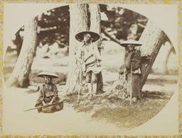 de l'écrivain populaire Jippensha Ikku (十返舎一九, 1765-1831). Ces trois superbes portraits de véritables pèlerins en route tranchent avec les portraits de modèles habillés en pèlerins, maquillés et vêtus de blanc immaculé des compositions en studio de Felice Beato, Raimund von Stillfried et Kusakabe Kimbei… Dans l'album, cette vue de taille moyenne, est collée sur la même page que la précédente (cf. 10566). 1. Ainsi, pour le Kansai, les 33 Kannon de Mikawa, les 33 Kannon d'Owari, les 33 Kannon de Mino, ou le pèlerinage à Ise ou à Ikuta. 2. Le sandogasa est un chapeau plat au bord arrondi confectionné en bambou tressé. À l’intérieur, le chapeau repose sur une base circulaire ajustable, appelée atamadai, qui permet d'ajuster la même taille de chapeau à tous les tours de tête. 3. Tōkaidōchū Hizakurige (東海道中膝栗毛), abrégé en Hizakurige, qui se traduit littéralement par « À la force du mollet sur le Tōkaidō », est un roman comique picaresque relatant les mésaventures de deux compères, Yajirobē et Kitahachi, qui voyagent d'Edo à Kyōto sur la route du pèlerinage au Ise-jingu. Il fut publié en douze parties entre 1802 et 1822.Notes