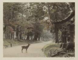 Ce même photographe diffusa en 1893 à des fins publicitaires, la reproduction d’un collage de mille sept cents photographies de portraits de bébés pris dans son atelier de 1890 à 1893. Auparavant, avec le procédé au collodion humide, les temps de poses étaient trop longs pour faire poser un bébé turbulent sans flou de bougé. Bien que le lieu, le Kasuga taisha, puisse être parfaitement identifié, cette image fonctionne comme une illustration générique du Japon et ne comporte pas de cartouche, contrairement à la quasi-totalité des vues de paysages de cet album. Il est possible que ce visiteur ne soit pas passé à Nara, non accessible en train au début des années 1890, et n’ait pas souhaité que le nom de cette ville apparaisse dans l’album souvenir de son voyage. 1. Plus exactement, un cerf Sika (Cervus nippon). Notes