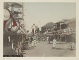La rue Benten-dōri (弁天通) à Yokohama, photographiée au printemps durant un festival, décorée avec des lanternes de papier et de branches de cerisiers en fleurs, vraies ou factices. On aperçoit dans la rue plusieurs jinrikisha et un grand char de festival décoré (dai). Durant l’ère Meiji, elle était la rue la plus commerçante du quartier japonais de Yokohama. Les étrangers pouvaient y « bibeloter » de l’ivoire ou de la porcelaine ou acquérir des albums de photographie aux couvertures japonisantes avec des plats en laques.