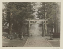 On remarque que le photographe, Tamamura, a préféré décentrer légèrement l’allée et le torii, contrairement à la composition plus classique du Baron Raimund von Stillfried (1839-1911), également conservée dans la collection de Guimet (cf. épreuve 11354). 1. La célèbre avenue de Tōkyō Omote sandō dans l’arrondissement de Shibuya est nommée ainsi car elle est l’allée principale qui mène au Meiji jingū, le sanctuaire shintoïste dédié à la mémoire de l’empereur Meiji et l’impératrice Shōken. Notes