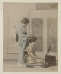 . » On reconnaît ici les même modèles que pour la photographie précédente (cf. épreuve 15926), dans le même décor et avec les mêmes kimonos mais coloriés différemment. La mise en couleur n’est pas toujours documentaire et les teintes des kimonos ne sont pas fiables… 1. Certains sont indisposés par l’odeur de l’huile de camélia qui sert à structurer les coques et qui rancit parfois… 2. DE GABRIAC Alexis, Course humoristique autour du monde. Indes, Chine, Japon, Paris, Michel Lévy Frères, 1872. p. 261. Cité par : BEILLEVAIRE Patrick, « L'autre de l'autre ». Contribution à l'histoire des représentations de la femme japonaise. In : Mots, no41, décembre 1994. Parler du Japon. p. 68. Notes