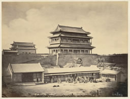 En 1864, rare encore étaient les photographes qui avaient pu photographier Pékin. Les photographies des portes et des murailles par Felice Beato, prises juste après l'arrivée des troupes anglo-françaises, sont vides de toute présence humaine alors que l'on note ici, au pied de la muraille, une délégation chinoise probablement venu accueillir la mission française. Parmi l'équipage de la Sémiramis participant également à la visite de Pékin se trouvait un autre artiste français Alfred-Victor Roussin (1839-1919) alors secrétaire du contre-amiral Jaurès qui était également un peintre amateur. Roussin fit un croquis de la même porte